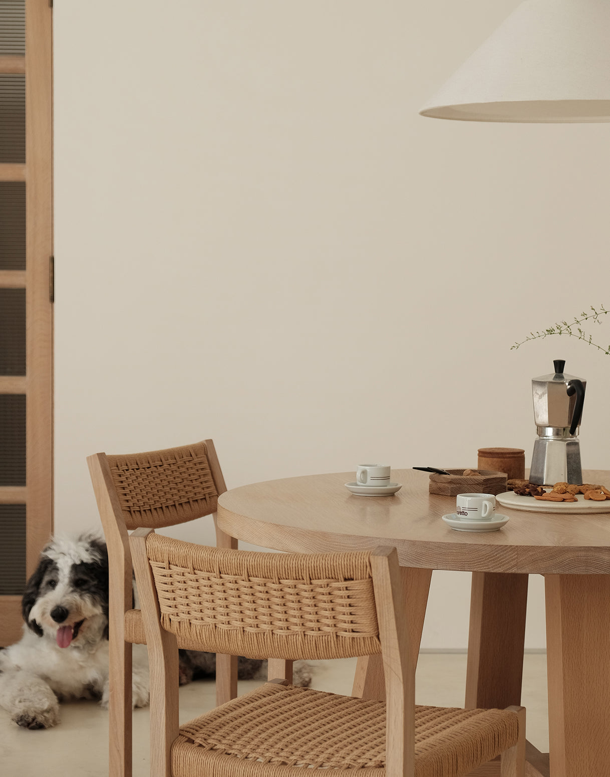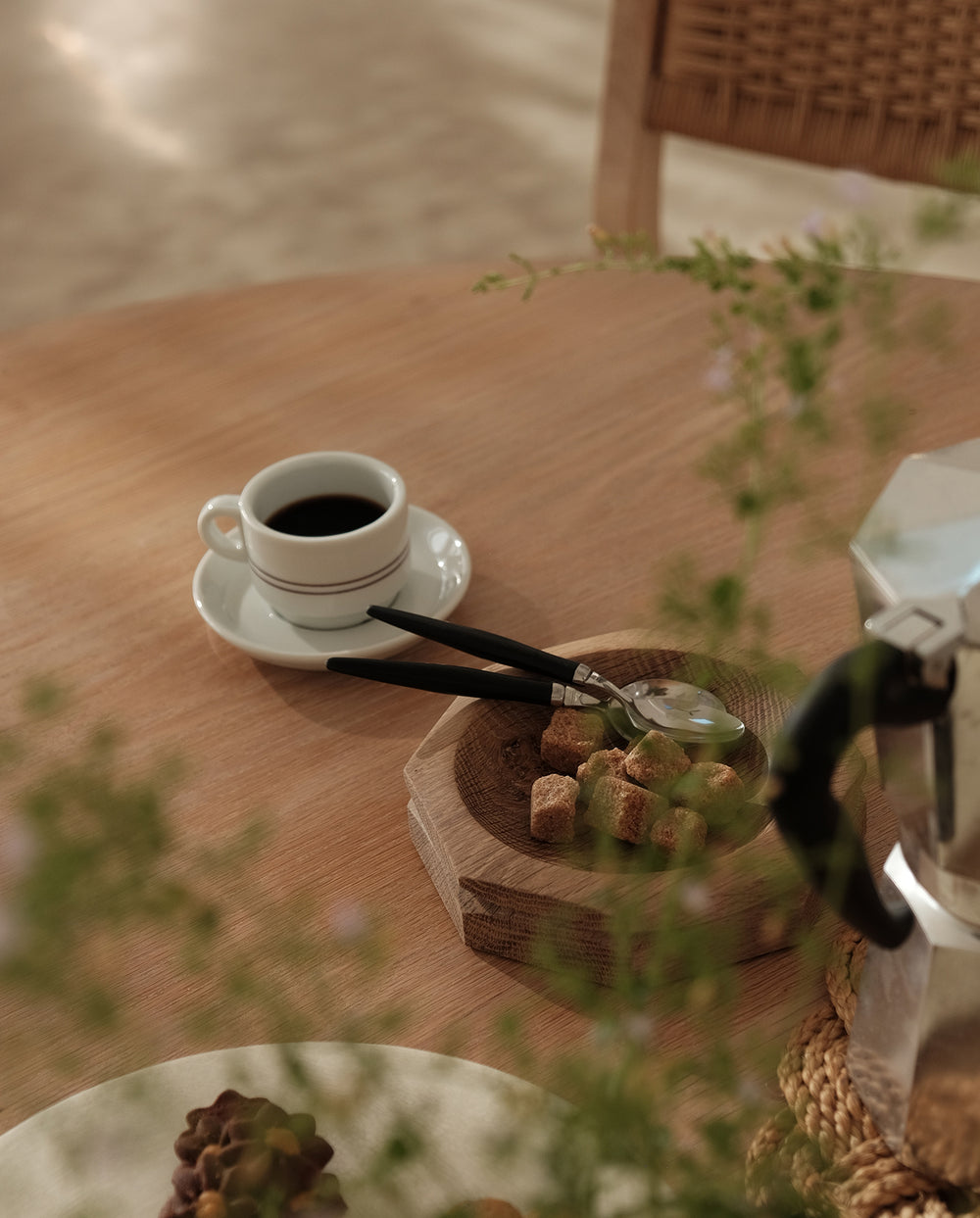 1. Morning rituals, made softer – white oak tray holding sugar cubes at the breakfast table. 2. The kind of morning where the coffee's hot, the dog's nearby and everything feels easy.