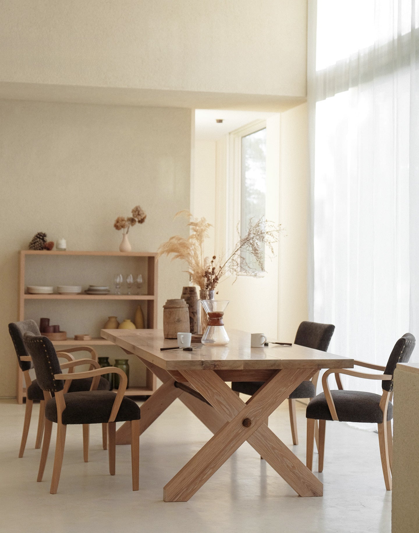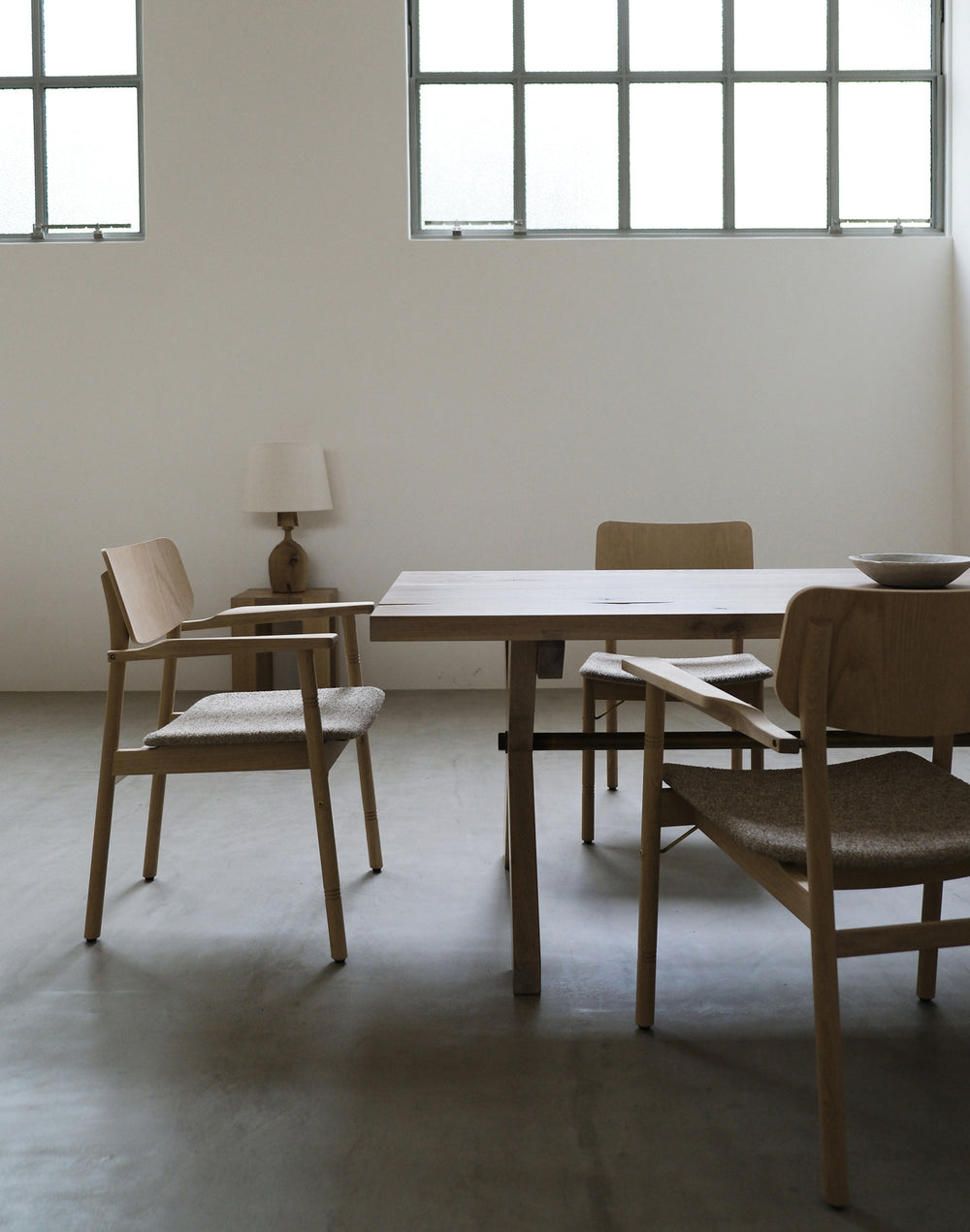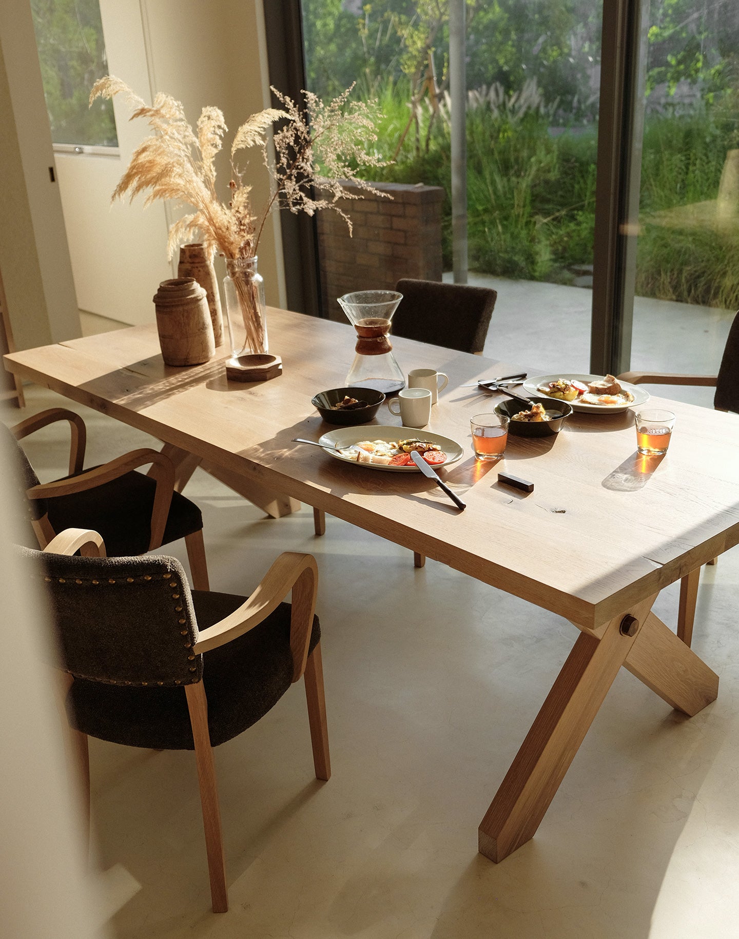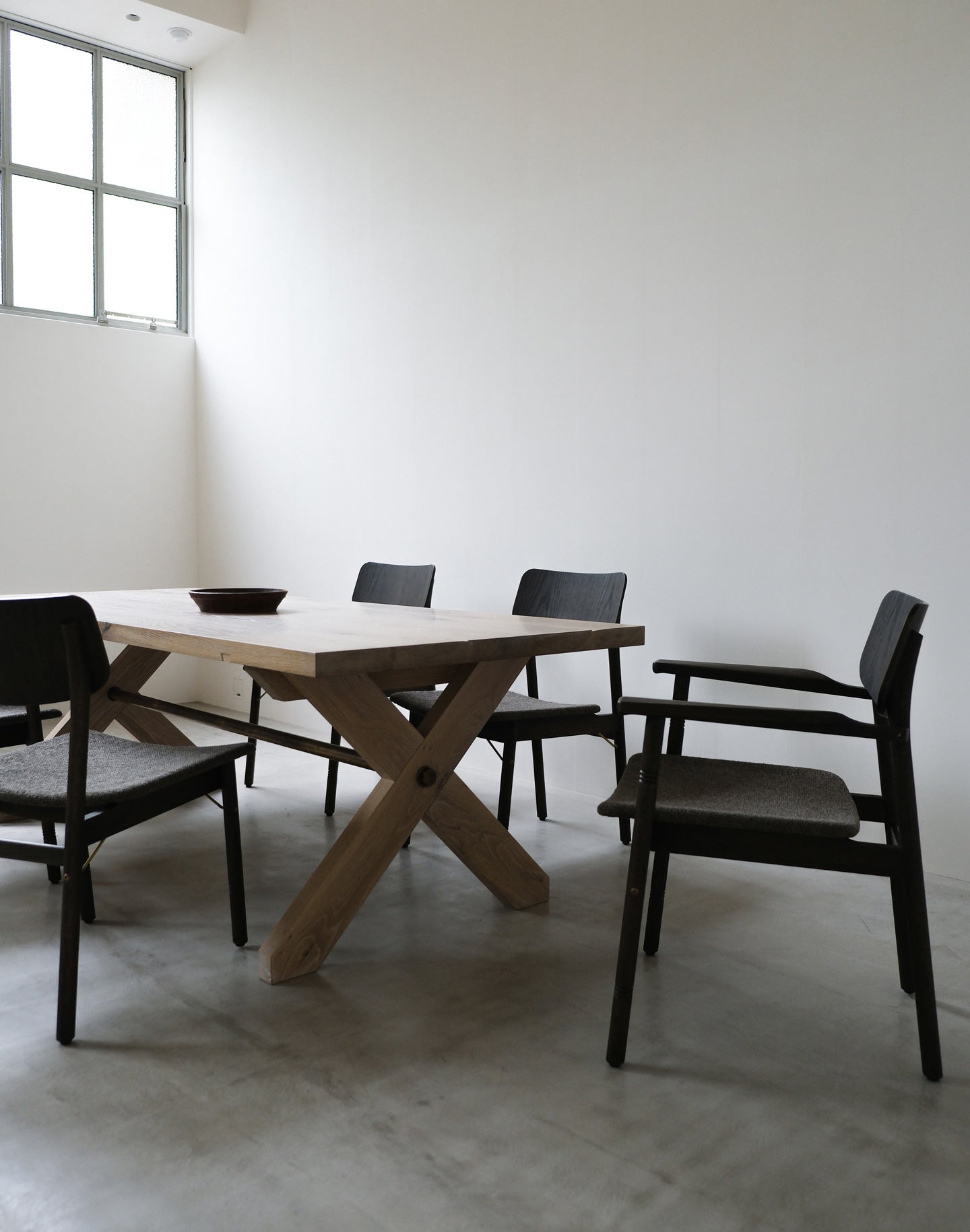 天板の反りを抑える蟻桟がしっかりと堂々と入っている。それがクロスした脚を受ける。その両側のクロスを真鍮の“ポール”がガッチリと繋ぎ、「任せろ」とばかりにじっと息を殺して支えている。そんなポールのことは、そこに座る人は気付かなくていい。ふと落としたフォークを拾う時に、はじめてポールと目が合う。静かに支える真鍮のポールに「素敵だな」と数秒見入ってしまうかもしれない。