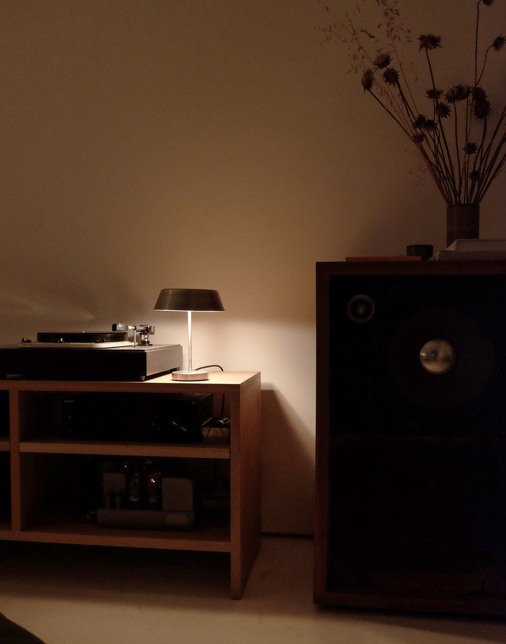 金属のシェードは手元をやさしく照らし、光の反射も穏やか。ベース部分に設けたスイッチは、暗がりでも手を伸ばせばすぐに位置が分かりやすく、実用性にも配慮されている。