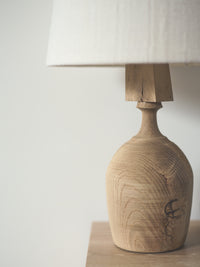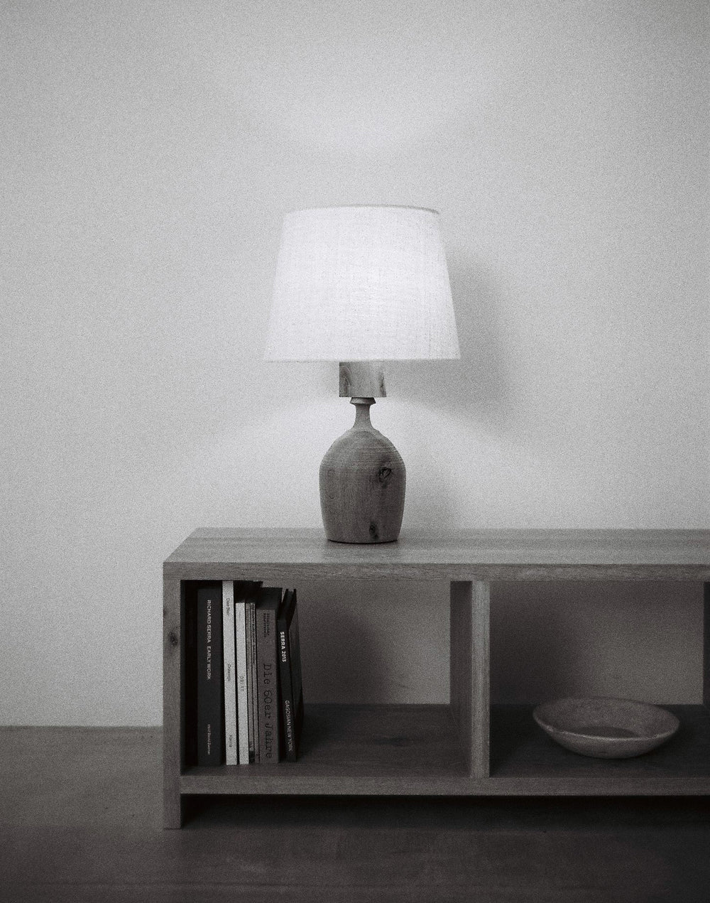 無塗装の木肌には木目や節の表情がそのまま現れ、一つとして同じものはない。素朴さの中にエッジの効いた要素があり、空間をやさしくも凛と引き締めてくれるランプ。