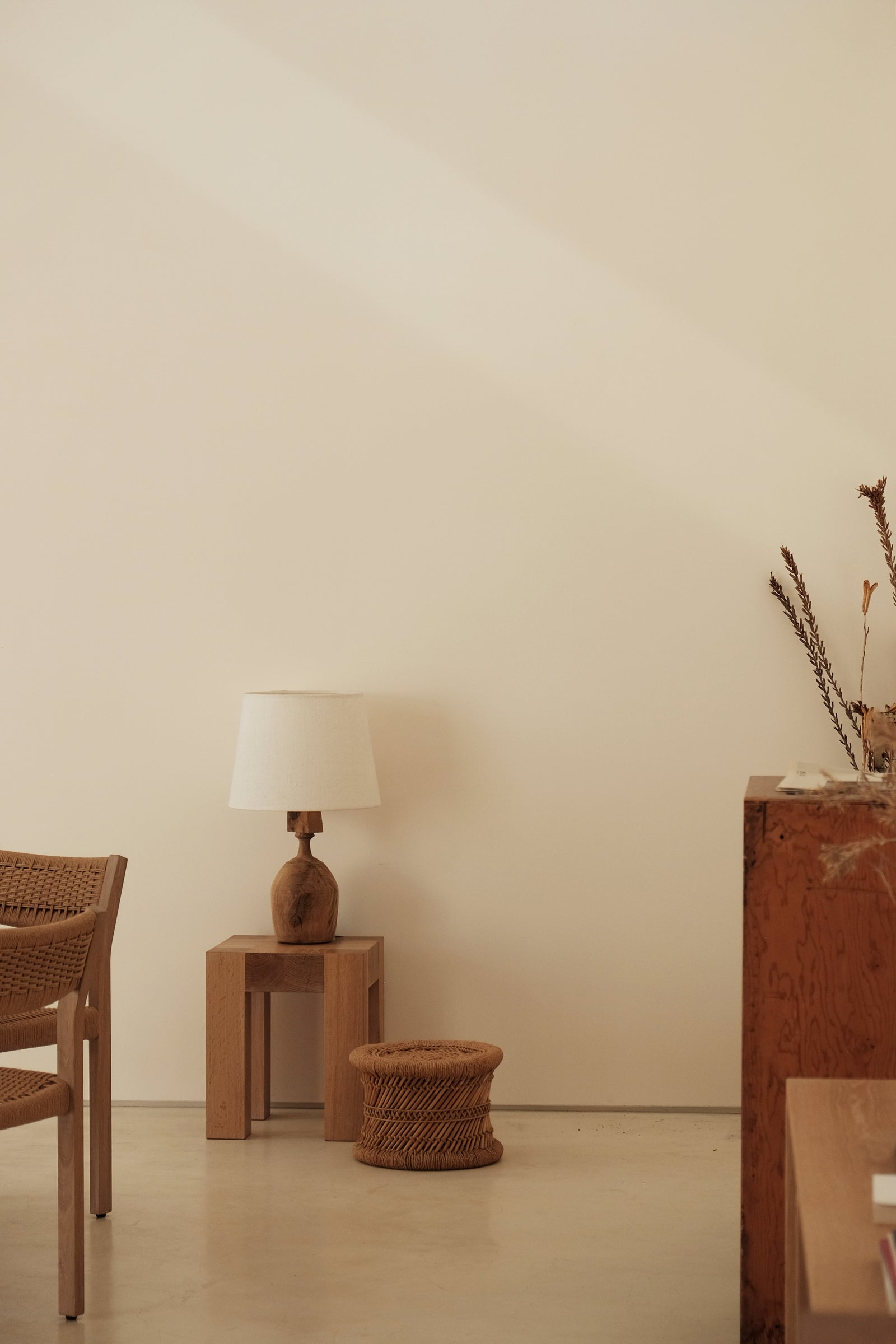 シェードには、ラオスの村で昔ながらの方法で紡がれた無着色のコットンを使用。素朴な木部とその質感が重なり合い、独特の世界観が生まれた。